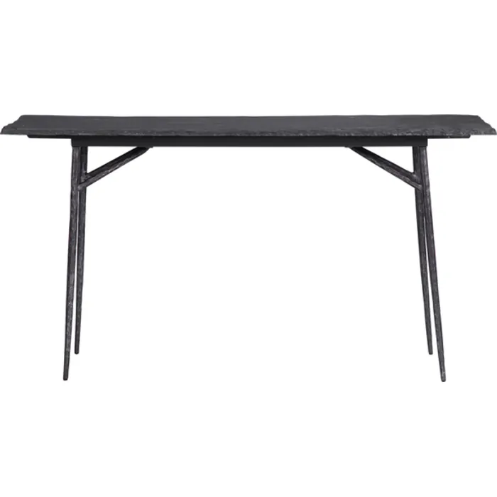 - Showcasing A Modern Industrial Look, This Console Features Naturally Textured Black Slate With Organic Broken Edges. Rests On An Iron Trestle Base With Chiseled Details Finished In Aged Black. Each Top Will Have Naturally Occurring Color Variations Such As Mottling As Well As Naturally Formed Vein Lines, Making Each Piece Unique.