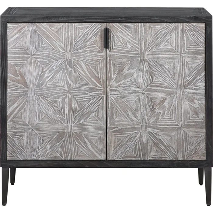 - Showcasing A Modern Lodge Style, This Two Door Cabinet Features Hand Pieced Mosaic Doors In Oak Veneer Finished In Light Gray, With A Contrasting Elm Veneer Exterior Finished In Deep Black With Light Gray Glazing. Accented With Solid Iron Hardware And Legs In Aged Black. Has One Fixed Interior Shelf.
