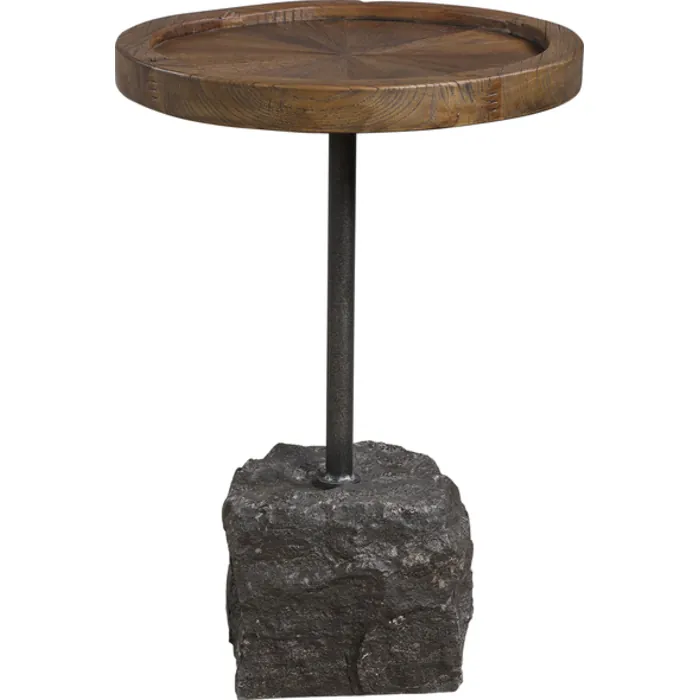- A True Rustic Centerpiece, This Accent Table Appeals To Many Design Styles With A Natural Recycled Elm Top Showcasing An Inlaid Starburst Pattern. Accented With An Aged Iron Support Element And Stabilized By A Rough Chiseled Bluestone Block With Inherent White Marbling And Veining Throughout.