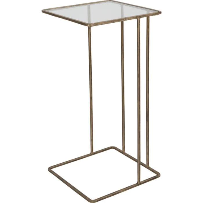 - Minimally Designed With Versatility, This Petite Hand Forged Iron Accent Table Is Finished In Heavily Antiqued Gold With A Clear Tempered Glass Top.