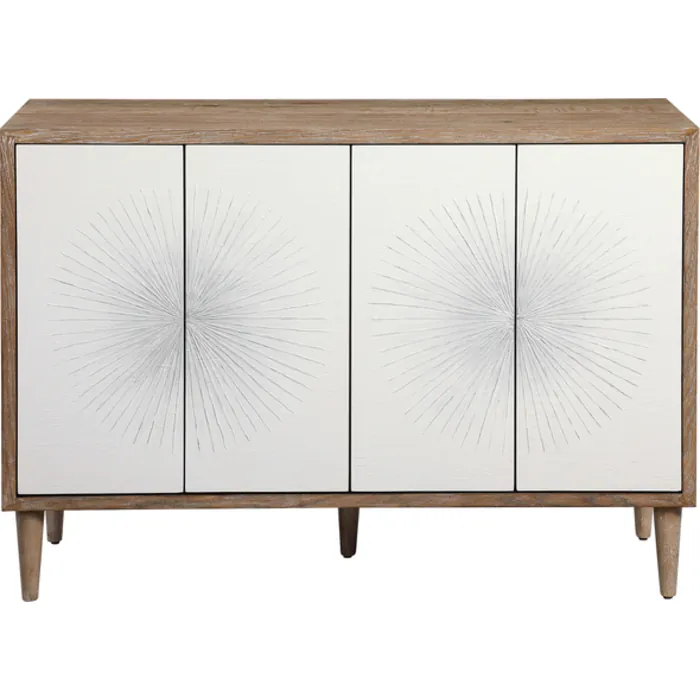 - Showcasing Hints Of Scandinavian Design, This Four Door Accent Cabinet Provides A Functional Storage Piece With Versatile Style. Featuring Matte White Textured Doors With A Striking Starburst Design With Ombre Gray Centers. The Case Is Layered In Naturally Finished Oak Veneer With Wire Brushed Details, Set On Tapered Legs. Each Side Opens To Reveal Two Adjustable Shelves.