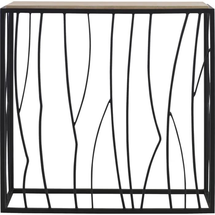 - Inspired By Natural Landscapes, This Console Table Features An Asymmetrically Designed Metal Base Finished In Dark Iron Paired With A Natural Tan Travertine Top. True To The Nature Of Natural Materials, Each Piece Will Have Unique Marbling And Veining Throughout.