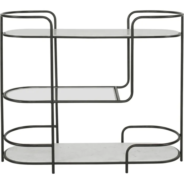 - Inspired By A Mix Of Classic Mod Design And Contemporary Styling, This Multifunctional Piece Can Serve As A Bar, Server, Or Console Table. The Curved Iron Frame Is Finished In Satin Black, Accented By White Marble And Tempered Glass Shelving. Because Of The Natural Characteristics Of Marble, Each Piece Will Have Unique Veining Patterns.