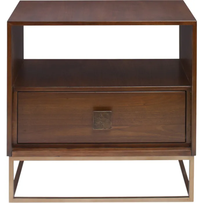 - Versatile Function With Modern Styling, Fully Finished In A Dark Walnut Over Walnut Veneer. Features An Open Pass-through For Decorative Storage And A Pull-out Drawer With An Embossed Metal Pull Finished In Antique Brass, Set Atop A Brushed Brass Open Framed Iron Base.