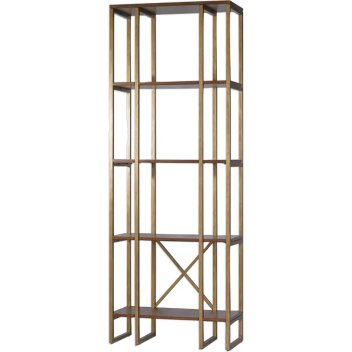 Easily Display Items On This Transitional Etagere, Finished In A Brushed Antique Gold And Accented By Four Acacia Veneer Fixed Shelves In A Rich Dark Walnut Stain.