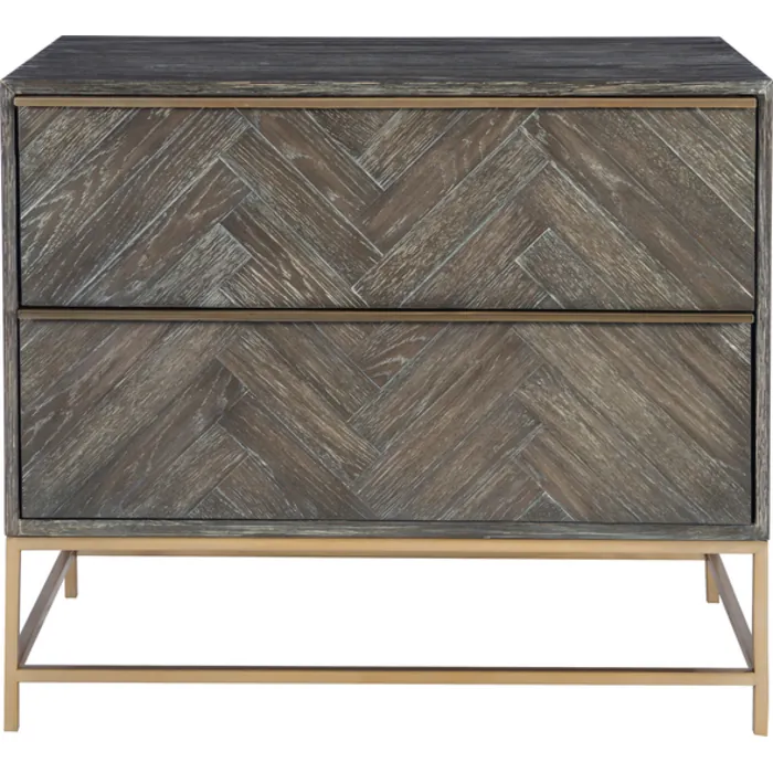 - Showcasing Understated Style, This Two Drawer Chest Is Layered In A Dark Walnut Finished Oak Veneer Accented With Herringbone Drawer Fronts. Rests On A Steel Base In Plated Brushed Brass With Coordinating Drawer Pulls.