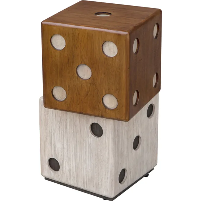 - This Asymmetrical Stacked Dice Accent Adds A Playful Touch To Your Game Room Decor. Each Layer Is Constructed From Solid Suar Wood In Natural Wood Tone And Whitewashed Finishes With Distressed Ebony And White Accents.