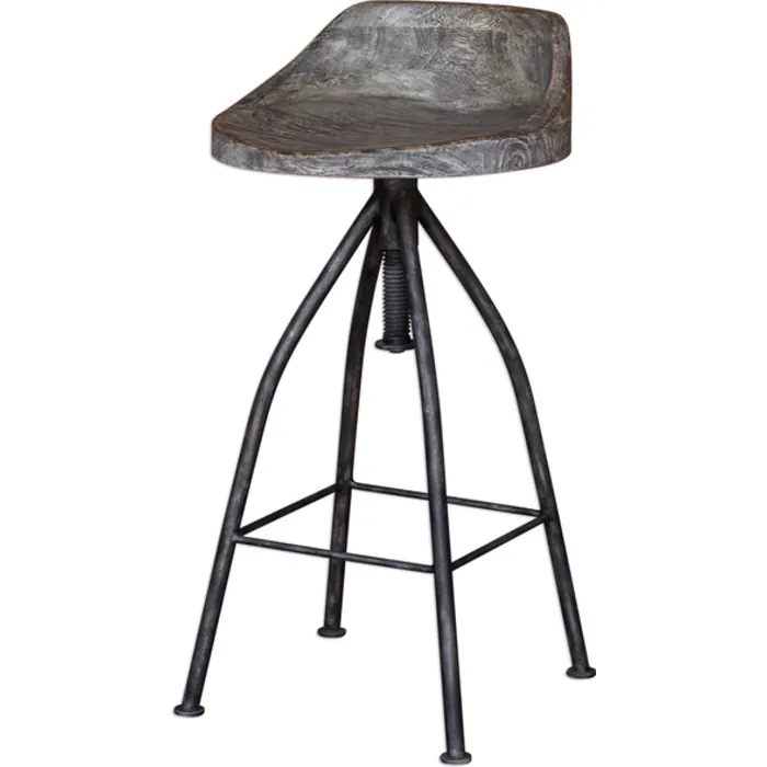 - Solidly Constructed With Industrial Swivel Screw, On Blackened Zinc Iron, With Hand Carved Seat In A Gray Glazed Driftwood Finish. Seat Adjusts From 26" To 33".