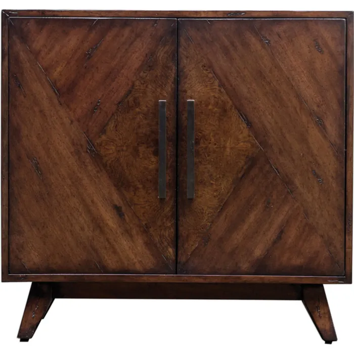 - Mid-century Inspired Styling, With Geometrically Pieced Mango Veneer Doors Accented With An Ash Burl Veneer Center Finished In A Deep Mahogany Stain With Natural Distress Marks And Burnishing, Complete With Antique Brass Finished Bar Handles. Includes One Adjustable Interior Shelf.