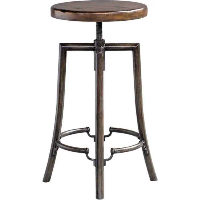 - Featuring A Natural Suar Wood Top Finished In A Lightly Burnished Dark Walnut Stain Revealing Warm Honey Undertones, Set A Top A Refined Industrial Base Crafted From Hand Forged Iron And Finished In An Aged Steel. Seat Adjusts From 25 To 32" Height.