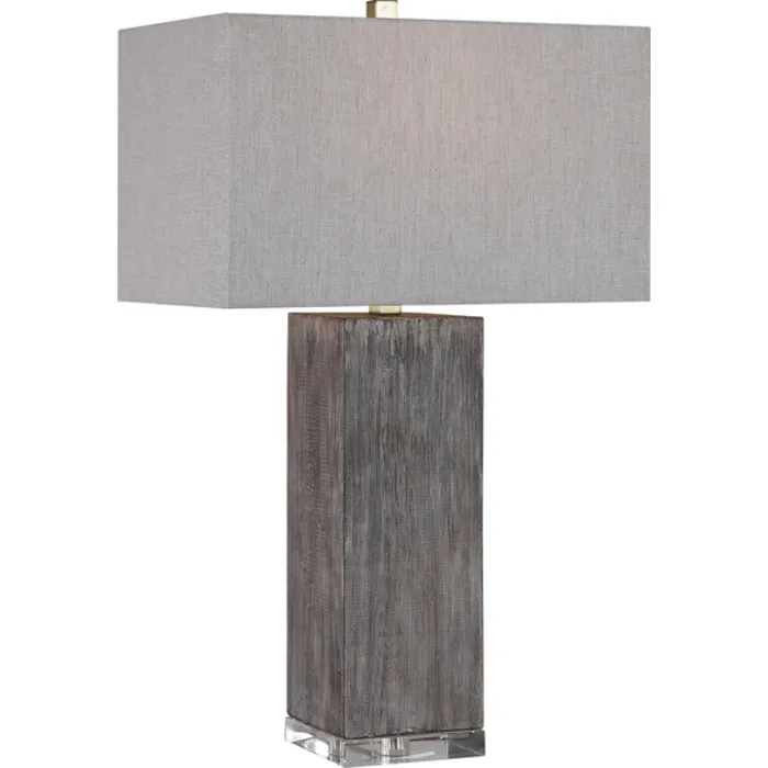 Contemporary In Design, This Table Lamp Is Finished In A Rustic Wood Look With Tones Of Light Gray, Dark Gray, And Aged Brown. A Thick Crystal Foot And Antiqued Brushed Brass Hardware Compliment The Piece. A Light Gray Linen, Rectangle Hardback Shade Completes This Design.