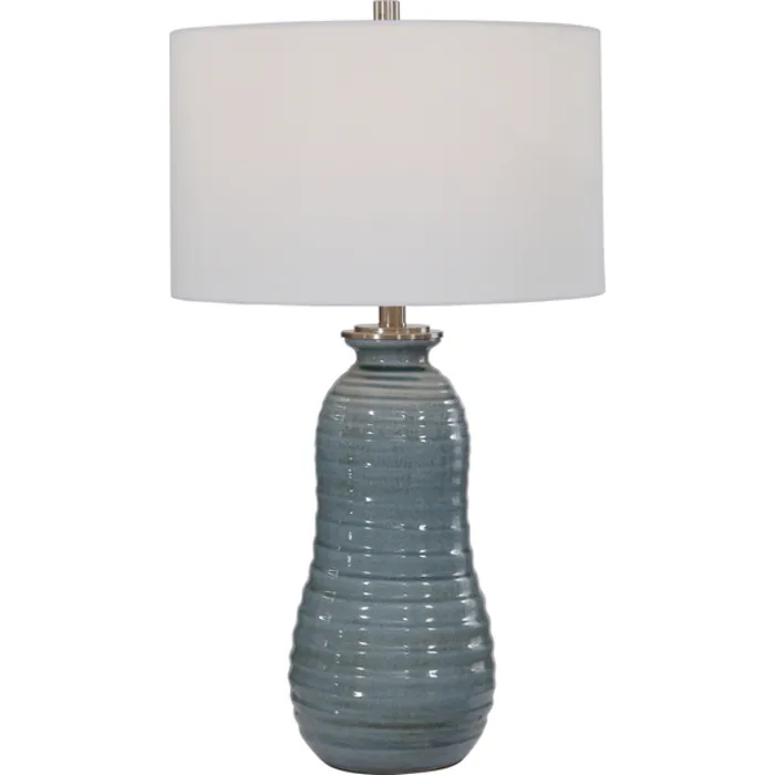 This Ceramic Table Lamp Has A Tapering Ribbed Surface That's Finished In A Light Blue Crackled Glaze, Accented With Brushed Nickel Details. A Hardback Drum Shade In White Linen Compliments This Piece. Due To The Nature Of Fired Glazes On Ceramic Lamps, Finishes Will Vary Slightly.