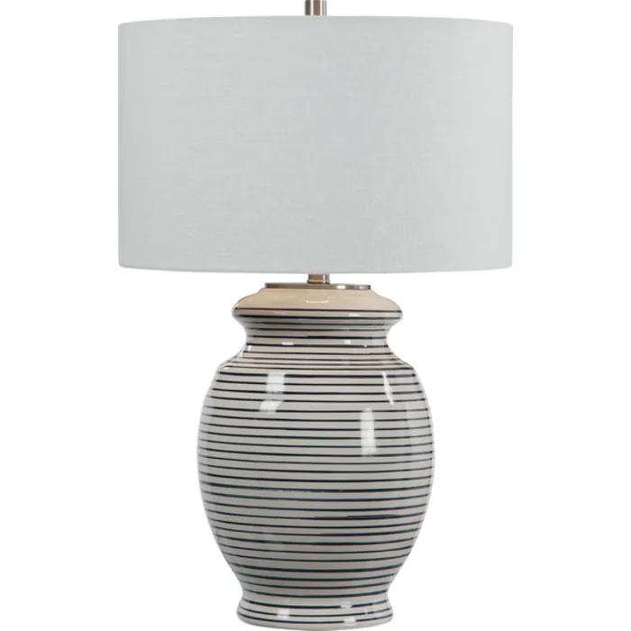 - This Table Lamp Has A Ceramic Base Finished In An Off-white Glaze With Navy Blue Stripes, Accented With Brushed Nickel Details.