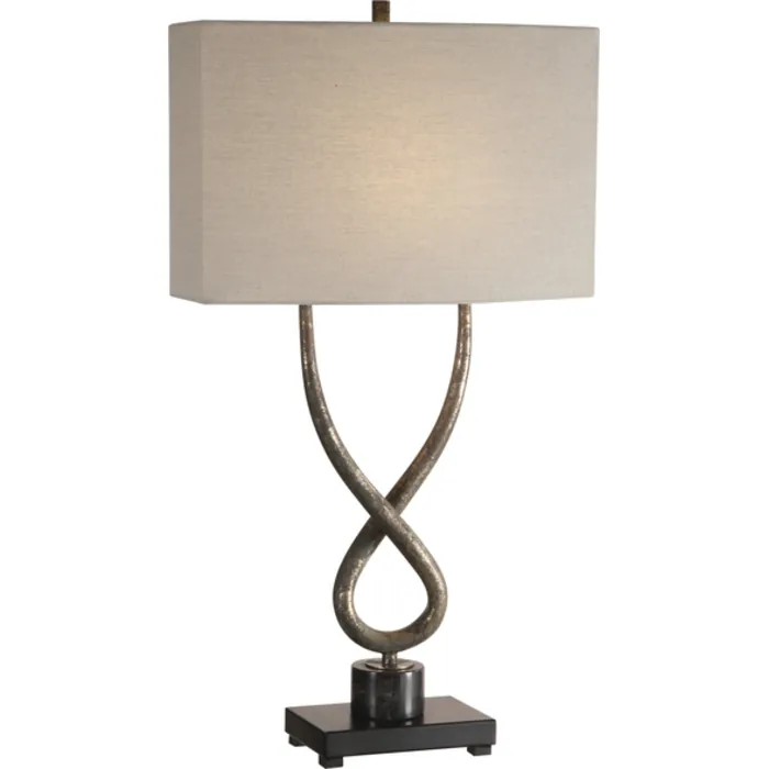 This Twisted Steel Base Is Gracefully Curved With A Subtly Tapering Design, Finished In A Heavily Distressed Aged Silver Leaf With Charcoal Undertones, Displayed On A Black Marble Column. The Oval Hardback Shade Is A Light Beige Linen Fabric With Straight