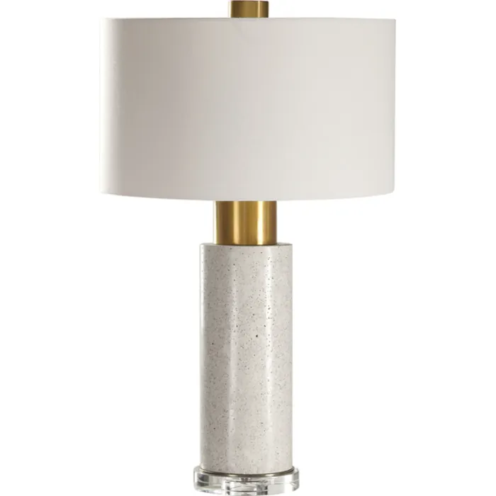 This Solid Concrete Column Base Features A Polished Surface Finished In A Bleached Wash, Accented With A Thick Crystal Foot, And Brushed Brass Plated Details. The Round Hardback Drum Shade Is A White Linen Fabric.