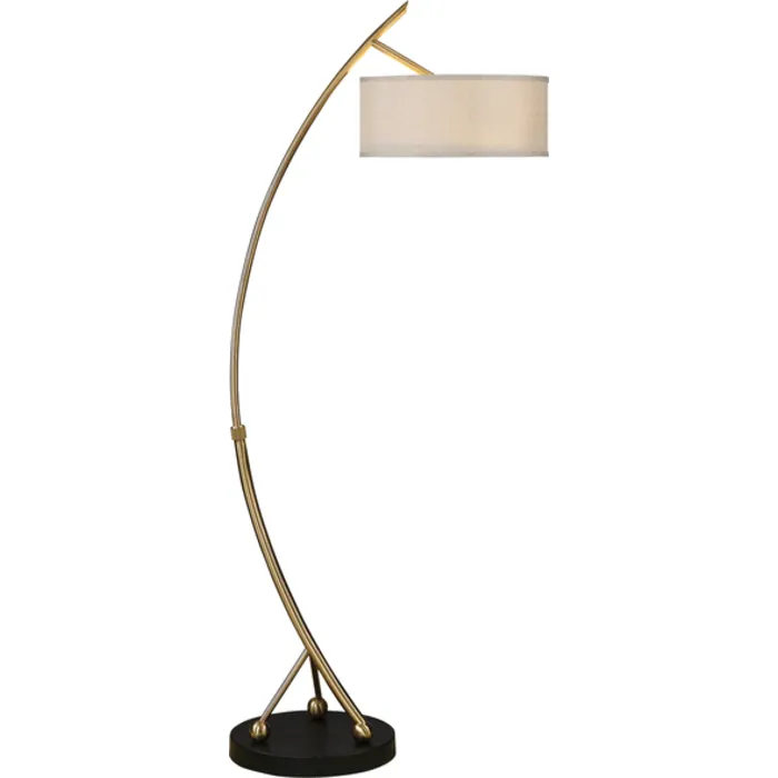 Curved metal finished in a plated brushed brass accented with a rust black foot. The base allows for adjustable height. The round hardback drum shade is a rust beige linen fabric.