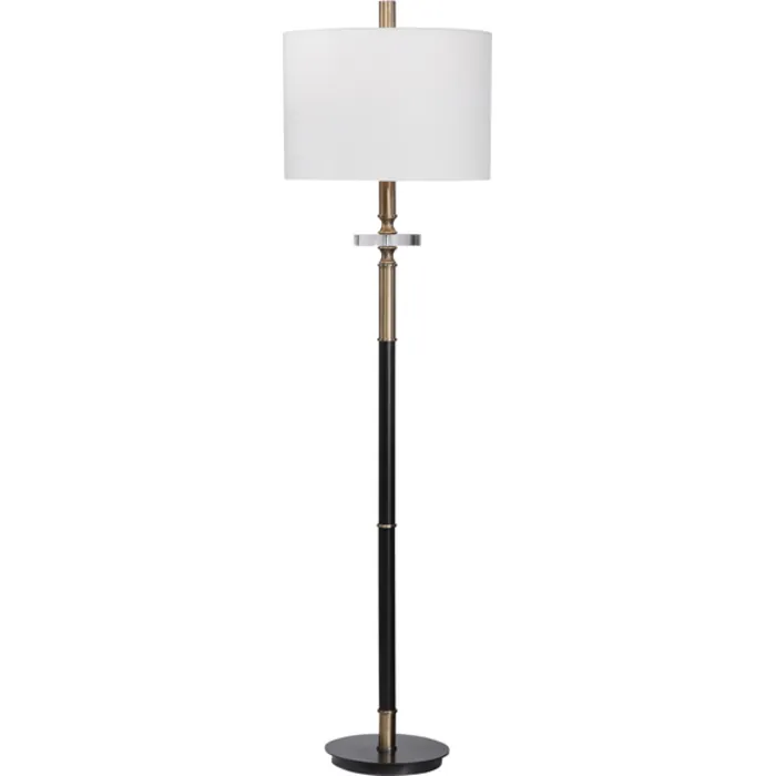 Traditional Elegance Is Showcased In This Floor Lamp, Finished In An Aged Black With Antique Brass Plated Accents And A Thick Crystal Ornament. The Round Hardback Drum Shade Is A White Linen Fabric.