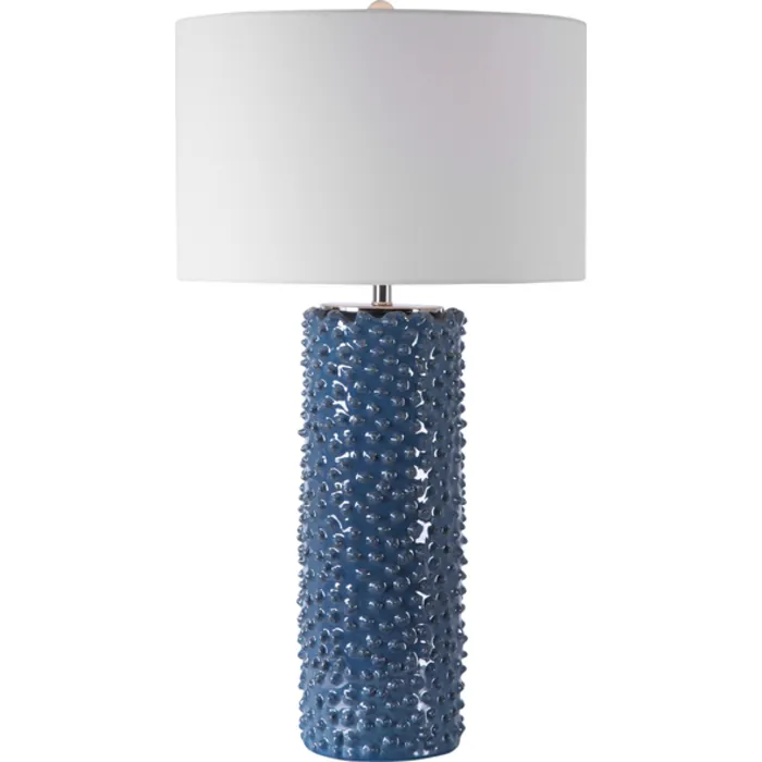 Featuring A Casual Coastal Style, This Table Lamp Showcases Textural, Visual Interest Finished In A Deep Indigo Glaze With Brushed Nickel Accents And A Crystal Finial. The Lamp Is Paired With A White Fabric Round Drum Shade.