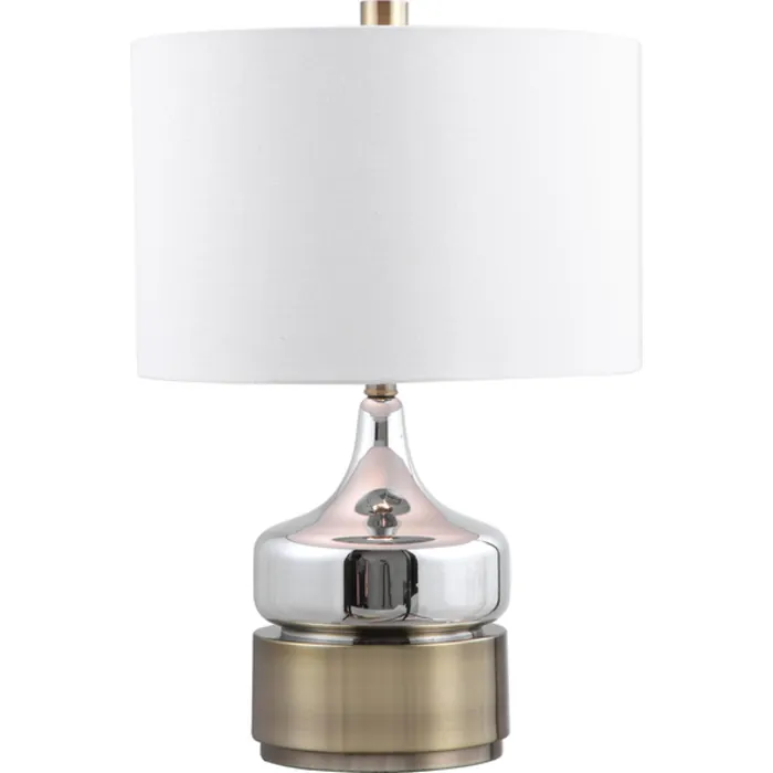 Paying Homage To Mid-century Style, This Table Lamp Features A Chrome Plated Glass Base Displayed On A Chunky Antique Brass Plated Foot And Finial. The Lamp Is Complimented By A Round Drum Shade In A White Linen Fabric.
