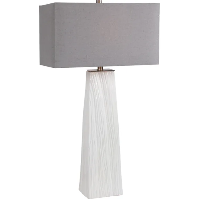 Elegant And Versatile, This Table Lamp Features A Gloss White Ceramic Base Featuring Organic Hand Carved Details And Brushed Nickel Accents. The Piece Is Paired With A Rectangle Hardback Shade In Gray Linen Fabric With Natural Slubbing.