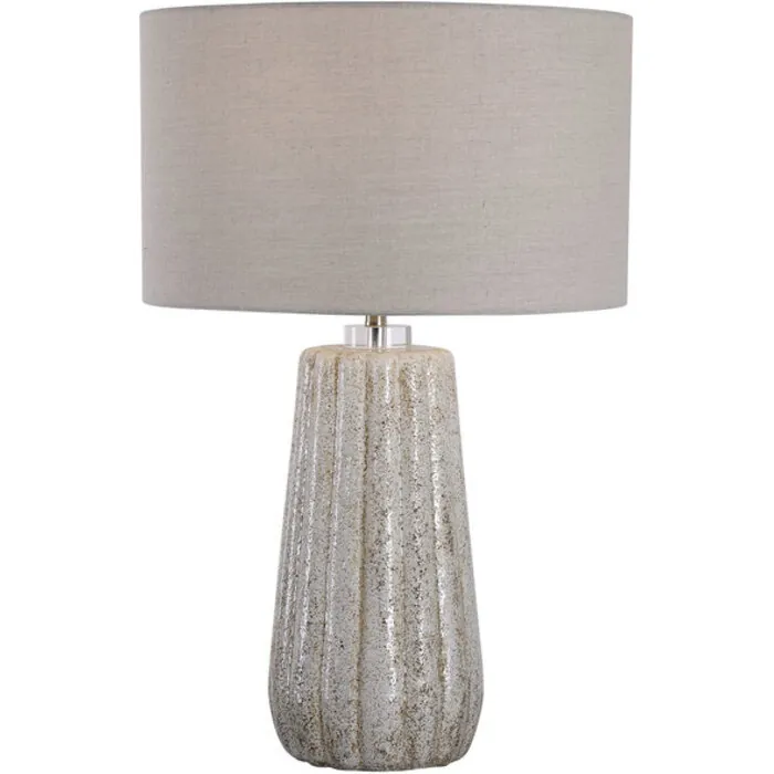 This Ceramic Table Lamp Features A Fluted Design With A Porous Texture Finished In A Stone-ivory And Taupe Glaze, Accented With Brushed Nickel Plated Details And A Thick Crystal Collar. A Light Gray Fabric Drum Shade Completes The Look.
