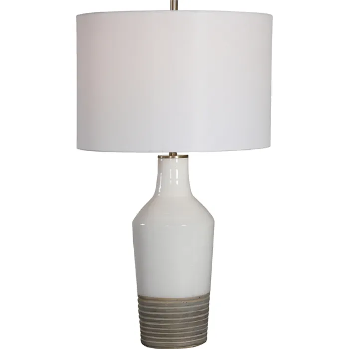 This Ceramic Lamp Features A White Crackle Glaze Finish Paired With A Ribbed Textured Bottom Half Finished In An Aged Terra Cotta Tone, Accented By Light Antique Brushed Brass Details. A Simple White Linen Fabric Drum Shade Compliments The Piece.