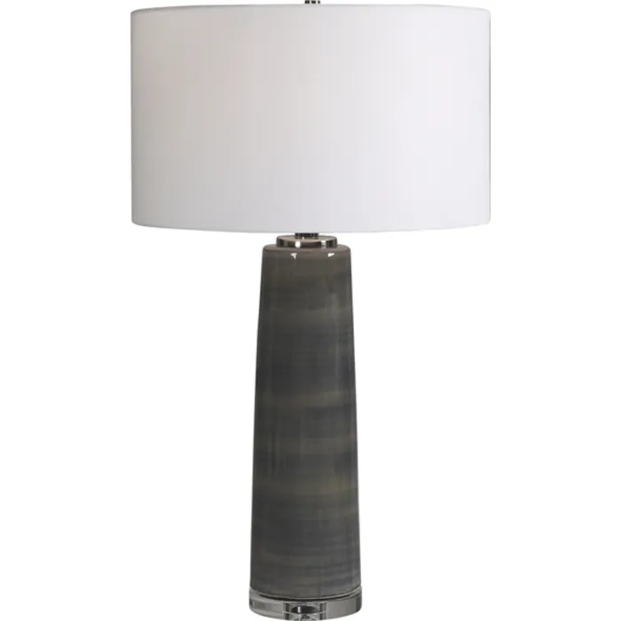 - Simple And Contemporary, This Ceramic Table Lamp Showcases A Subtle Striped Charcoal Gray Glaze, Accented With Polished Nickel Plated Details And A Thick Crystal Foot.