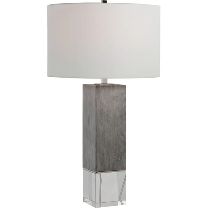 Inspired By Modern Lodge Style, This Table Lamp Features A Light Gray Oak Look, Accented By Polished Nickel Plated Details And A Crystal Foot That Elevate The Sophisticated Design. The Lamp Is Paired With A White Hardback Drum Shade.
