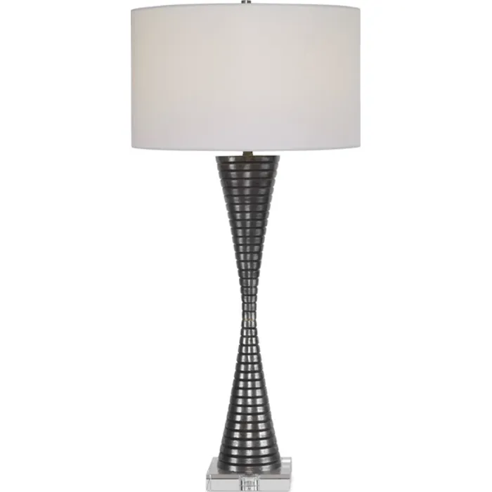 Constructed From Cast Iron, This Table Lamp Features A Masculine Look With Ribbed Texture And An Hourglass Silhouette, Displayed On A Thick Crystal Foot. A White Hardback Drum Shade Completes The Look.