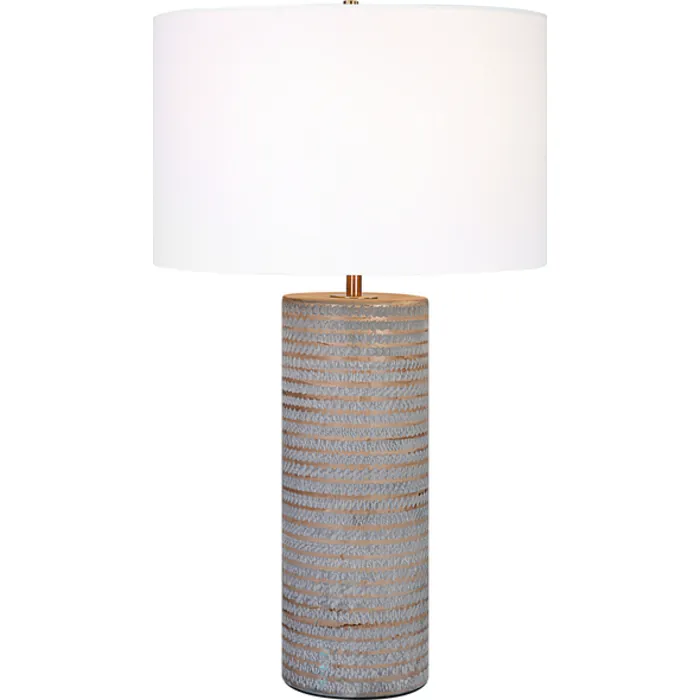 This Ceramic Table Lamp Showcases A Rustic Chiseled Texture With Frosted Pewter Gray Undertones And Organic Carved Accents In Light Sepia Tones. Iron Details Are Finished In Antique Brass. The Lamp Is Complimented By A White Fabric Drum Shade.
