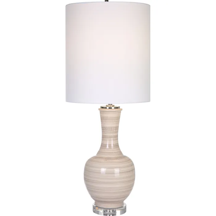 - This Table Lamp Showcases A Traditional Curved Silhouette In A Striking Striped Motif. The Ceramic Base Displays Shades Of Taupe, Tan, And Charcoal And Is Accented By A Thick Crystal Foot With Polished Nickel Plated Details.