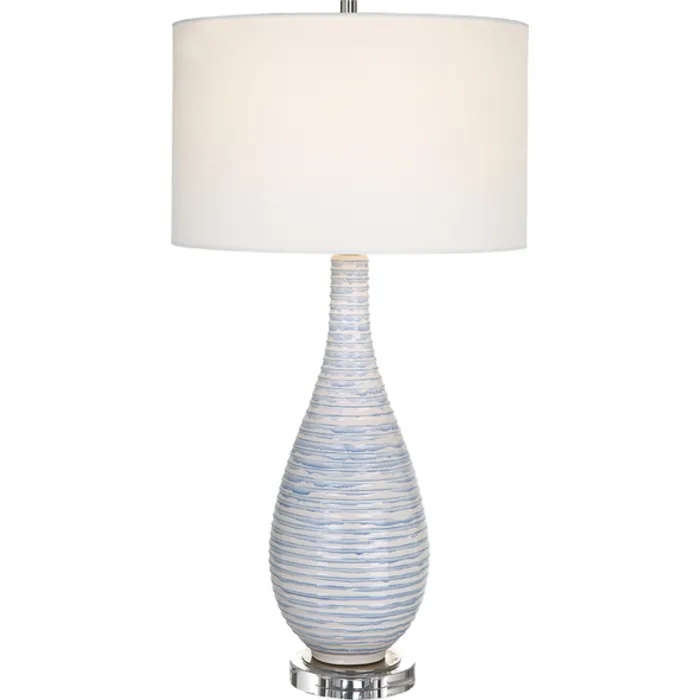 This Ceramic Table Lamp Features An Elegant Fluted Shape With Ribbed Texture Finished In A Soft Blue And White Drip Glaze. The Lamp Sits On A Thick Crystal Foot Paired With Polished Nickel Plated Details. A White Linen Drum Shade Compliments The Piece.