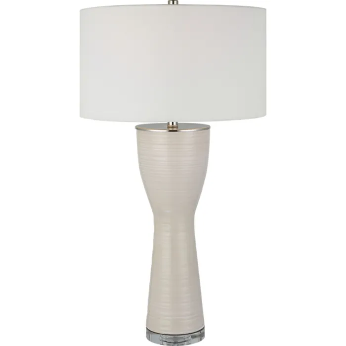 This Ceramic Table Lamp Displays An Elegant Curved Silhouette That Creates A Fresh Yet Traditional Feel. The Base Is Finished In An Off-white Crackle Glaze And Is Accented By Polished Nickel Plated Details. The Lamp Is Complimented By A White Fabric Drum Shade.