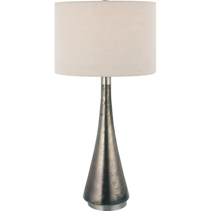 This Table Lamp Features A Graceful Tapered Base Crafted From Artisanal Blue-green Metallic Glass. Iron Accents Are Finished In Brushed Nickel. The Drum Shade Is Covered In A Light Oatmeal Fabric With Natural Slubbing.