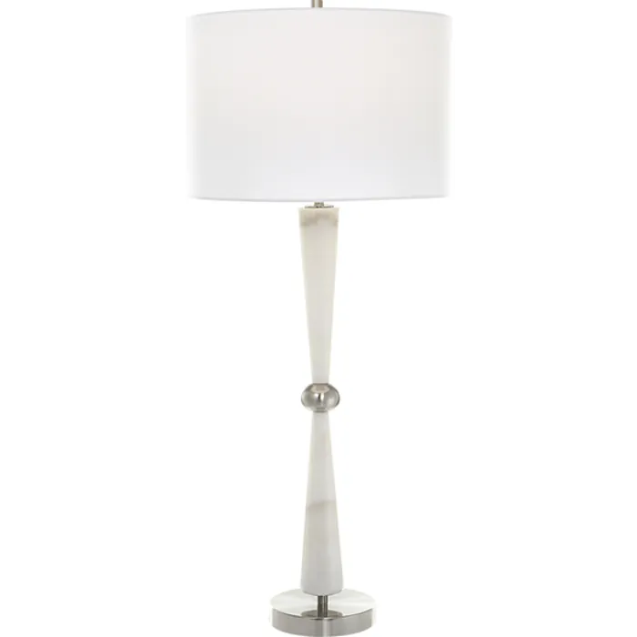 Timeless And Sophisticated, This Table Lamp Boasts Tapered White Marble With Subtle Gray Veining, Accented By Iron Details Finished In Brushed Nickel. A White Hardback Drum Shade Completes This Piece.