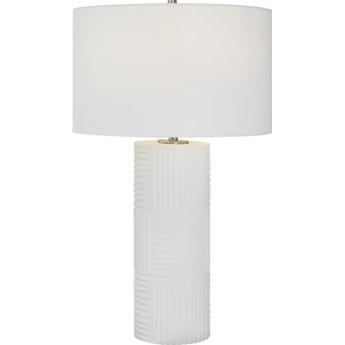 - This Cylinder Ceramic Table Lamp Features Alternating Linear Ridges Finished In A Stylish Satin White Glaze With Brushed Nickel Plated Iron Details.