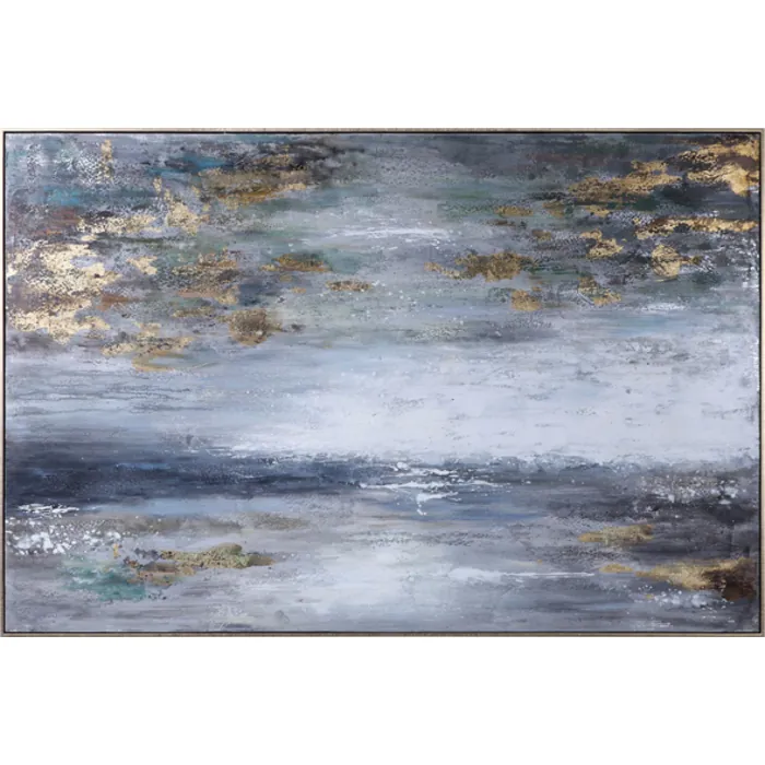 Moody Shades Of Gray And White Work Together To Create This Abstract Landscape Artwork. The Hand Painted Canvas Is Accented By Charcoal And Gold Leaf Tones And Is Paired With A Gold Gallery Frame. Due To The Handcrafted Nature Of This Artwork, Each Piece May Have Subtle Differences.