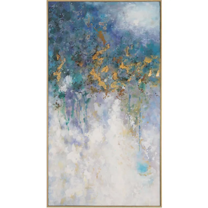Finish: Hand Painted Canvas Stretched Over Wooden Frame With A Gold Leaf Thin Floater Frame.