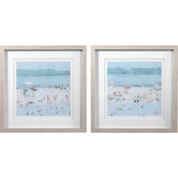 These Printed Beach Scenes Include Varying Shades Of Blue, Teal, And Beige With Pops Of Peach And Charcoal. A Light Driftwood Finished Frame And Double White Mats Compliment The Coastal Style. Each Print Is Placed Under Protective Glass.