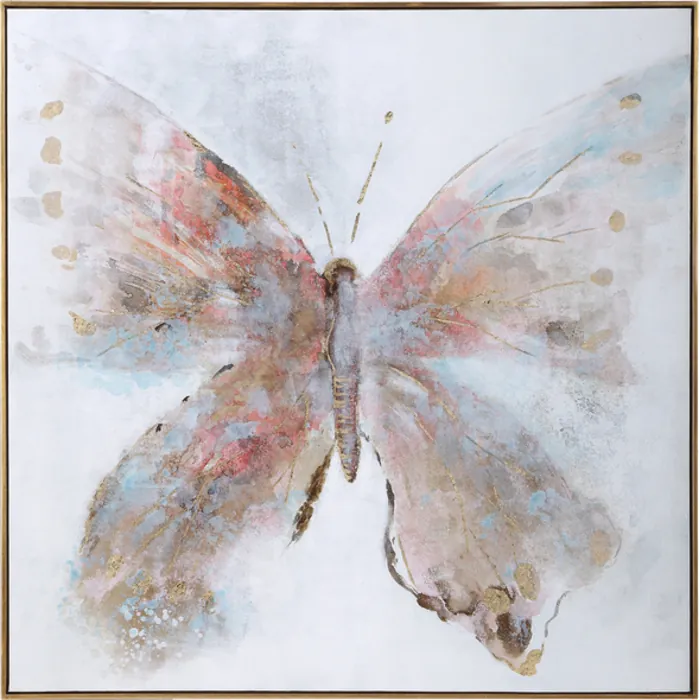 Showcasing A Whimsical Flair, This Hand Painted Canvas Pairs Vibrant Shades Of Fuchsia And Red-orange With Subdued Shades Of Powder Blue And Light Gray. This Contemporary Butterfly Artwork Also Features Hints Of Gold And Silver Leaf And Is Complimented By An Antique Gold Leaf Gallery Frame. Due To The Handcrafted Nature Of This Artwork, Each Piece May Have Subtle Differences.