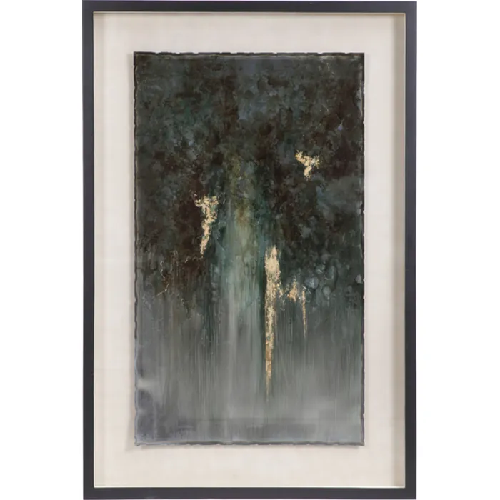 - Matte Black Frame With Tan Background And Under Glass, Burnt Metal, Heavy On Edges, Blues, Greens, Browns, Gold Leaf Highlights