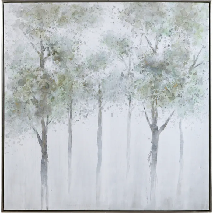 Hand Painted Forest Scene On Canvas Showcases A Watercolor Style With Soft Sage Green, Yellow And Gray Tones And A Silver Gallery Frame. Due To The Handcrafted Nature Of This Artwork, Each Piece May Have Subtle Differences.