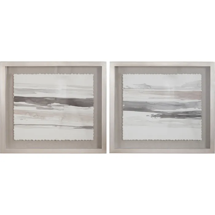 These Abstract Watercolors Add Transitional Style To A Space. Each Piece Features Light Gray, Charcoal, And White Hues On Deckled Parchment, Set Against An Oatmeal Linen Background. Each Original Watercolor Is Placed In A Champagne Silver Shadow Box Frame Under Protective Glass. This Artwork May Be Hung Horizontal Or Vertical.