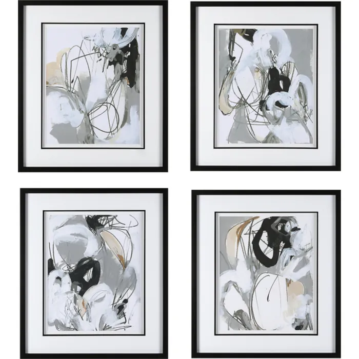 Displaying Perfect Contemporary Abstraction, This Set Of Artwork Pairs Neutral Color Tones With Expressive Lines And Bold Details. The Ebony, Taupe, And Gray Strokes Create A Modern, Yet Timeless Feel. Each Print Is Accented By Layered Black And White Matting With A Satin Black Frame Under Glass. Artwork By June Erica Vess.