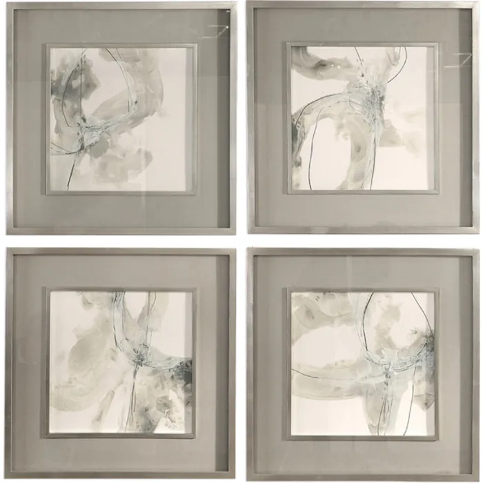 These Prints Feature Neutral Colors Of Warm Gray, Charcoal And Off-white Surrounded By Warm Gray Mats. Silver Leaf Frames And Fillets Complete The Artwork.