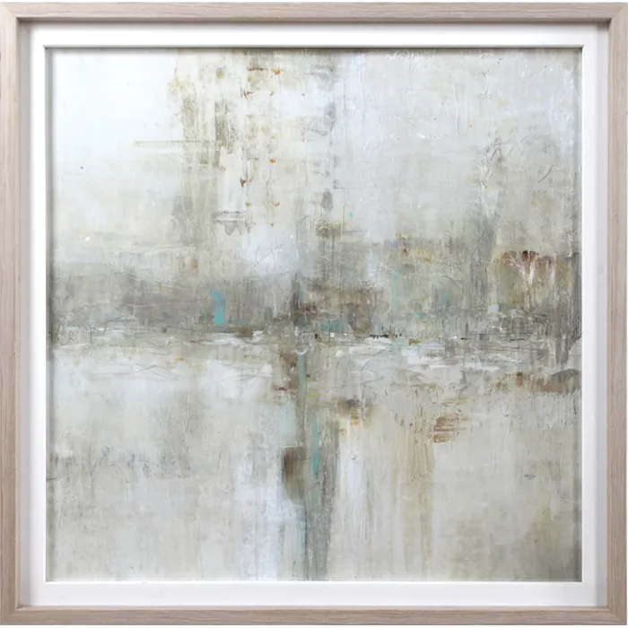 This Modern Abstract Print Features Hand Embellished Details That Add Dimension And Style. Shades Of Light Gray, Beige, And Tan Are Accented By Pops Of Turquoise And Rust. A Light Wood Frame With A Gray Wash And White Linen Inner Lip Complete This Piece. This Print Is Placed Under Protective Glass.