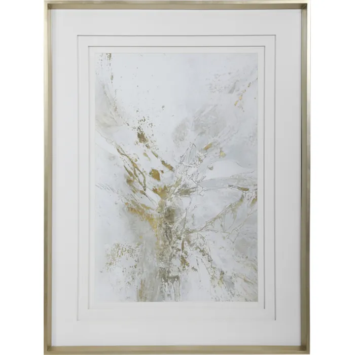 Create An Elegant Statement With This Feminine Abstract Print. The Neutral Artwork Features Shades Of Light Gray, White, And Gold Leaf. Triple White Matting And A Warm Silver Leaf Frame Complete This Sophisticated Piece. Print Is Placed Under Glass. Artwork By Jennifer Gardner.