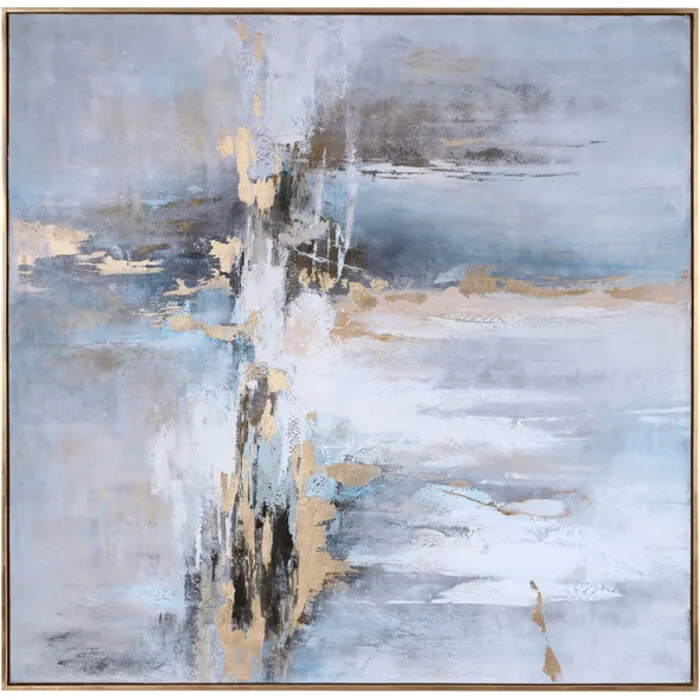 Hand Painted Abstract On Canvas Exhibits Light Gray And Blue Tones With Gold Leaf Accents And An Antique Gold Leaf Gallery Frame. Due To The Handcrafted Nature Of This Artwork, Each Piece May Have Subtle Differences.