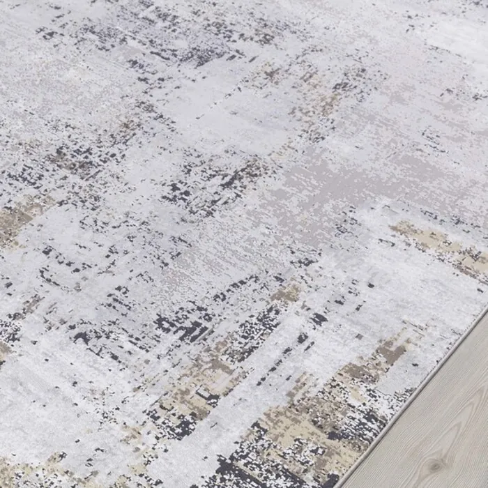 This Power Loomed Rug Features An Abstract Design In Multi Shades Of Gray And Hints Of Ivory, With Taupe Gold Detailing, Constructed From A Mix Of Polyester And Viscose For A Soft To The Touch Feel.