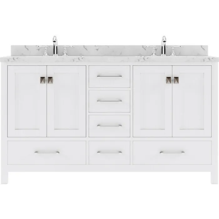 The Caroline Avenue vanity collection emanates an understated elegance that brings beauty and grace to just about any living space. Contemporary shaker style doors and clean lines make it a versatile addition to modern or transitional designs while offering bountiful storage as to not sacrifice functionality. Soft-closing door hinges and drawer glides provide added luxury, safety, and longevity. Each Caroline Avenue vanity is handcrafted with a 2" solid wood birch frame built to last a lifetime.The Caroline Avenue vanity collection emanates an understated elegance that brings beauty and grace to just about any living space.Contemporary shaker style doors and clean lines make it a versatile addition to modern or transitional designs while offering bountiful storage as to not sacrifice functionality.Functional & Versatile - Soft-closing door hinges and drawer glides provide added luxury, safety, and longevity. Each Caroline Avenue vanity is handcrafted with a 2" solid wood birch frame built to last a lifetime.Vanity kit includes quartz countertop in Cultured Marble. Unmatched in resilience, this countertop is non-porous and extremely resistant to impact, stains, and scratches. Conveniently pre-drilled for ease of installation and never requires sealing.Easy Installation - Base cabinet is fully assembled and ready to be installed.Bathroom Vanity Set - This vanity kit includes cabinet, sinks, and countertop. Components have been expertly designed and engineered for optimal stylistic fit and compatibility with this particular cabinet.Sized For Fit & Storage - 60 in. W x 22 in. D x 35 in. HIncludes - 60" White Cabinet, Cultured Marble Quartz Countertop, 2 Round Undermount SinksAmple Storage - 4 Total Functional Soft-Close Doors and 5 Total Functional Soft-Close Drawers